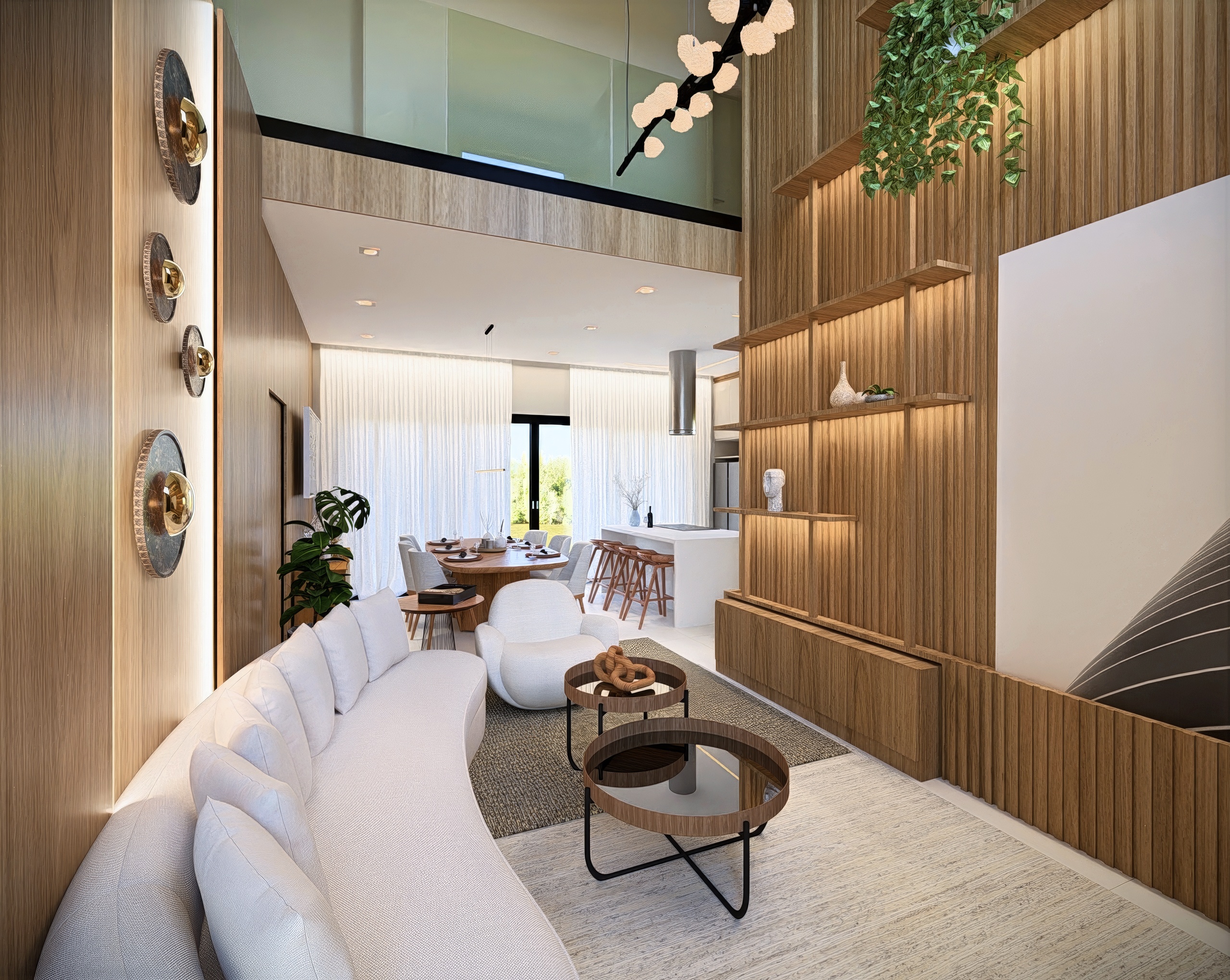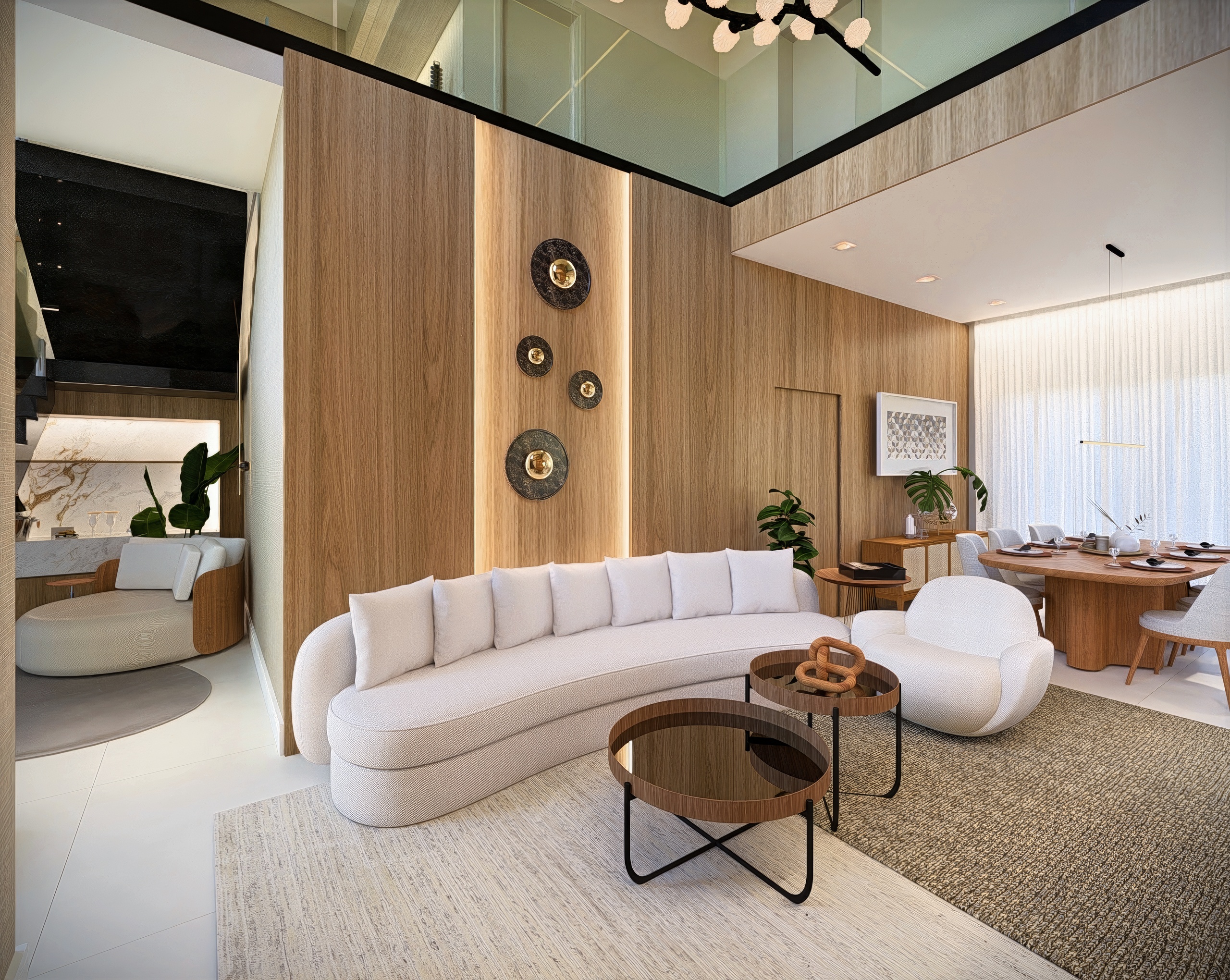 Sala de estar com pé-direito duplo, trazendo imponência e luminosidade ao ambiente